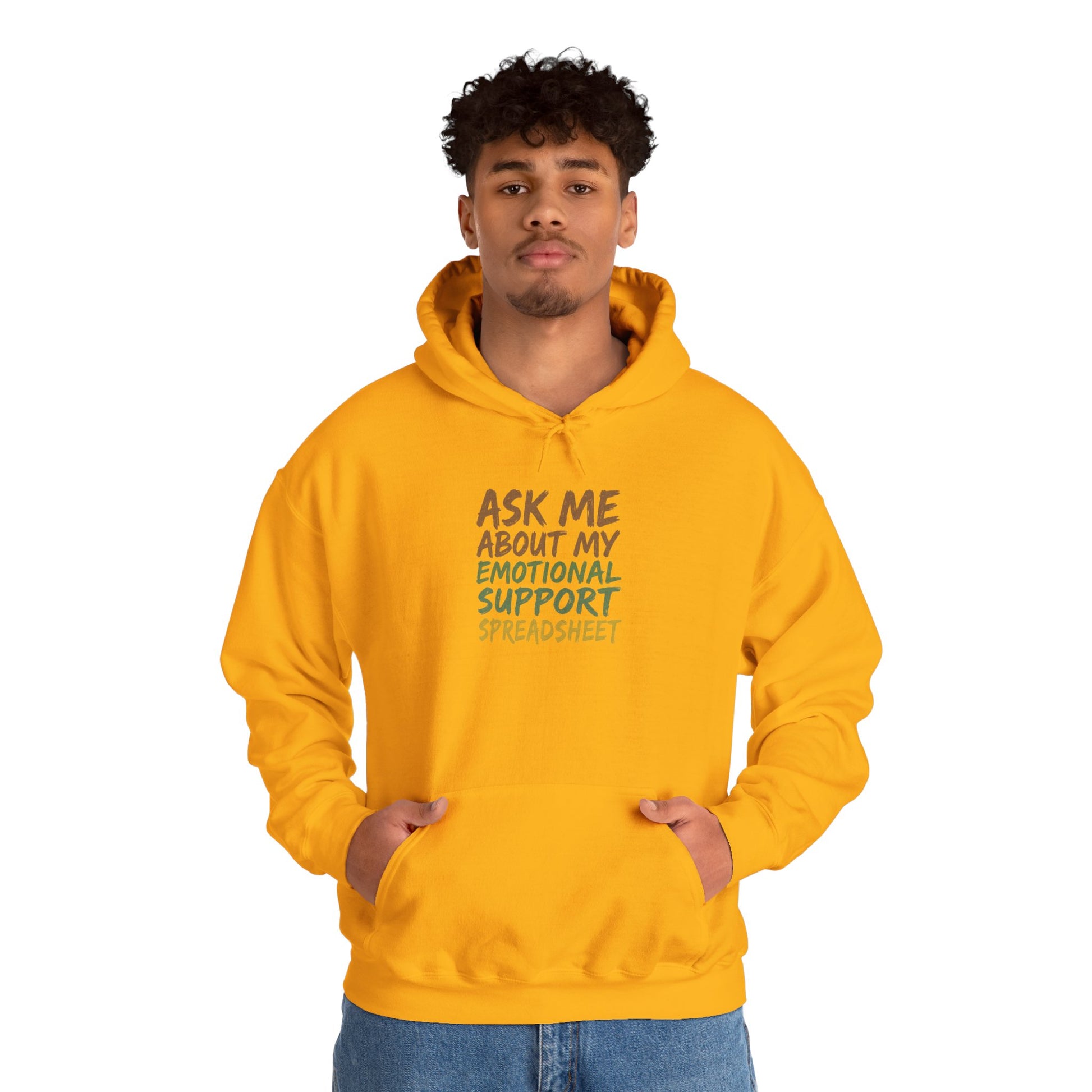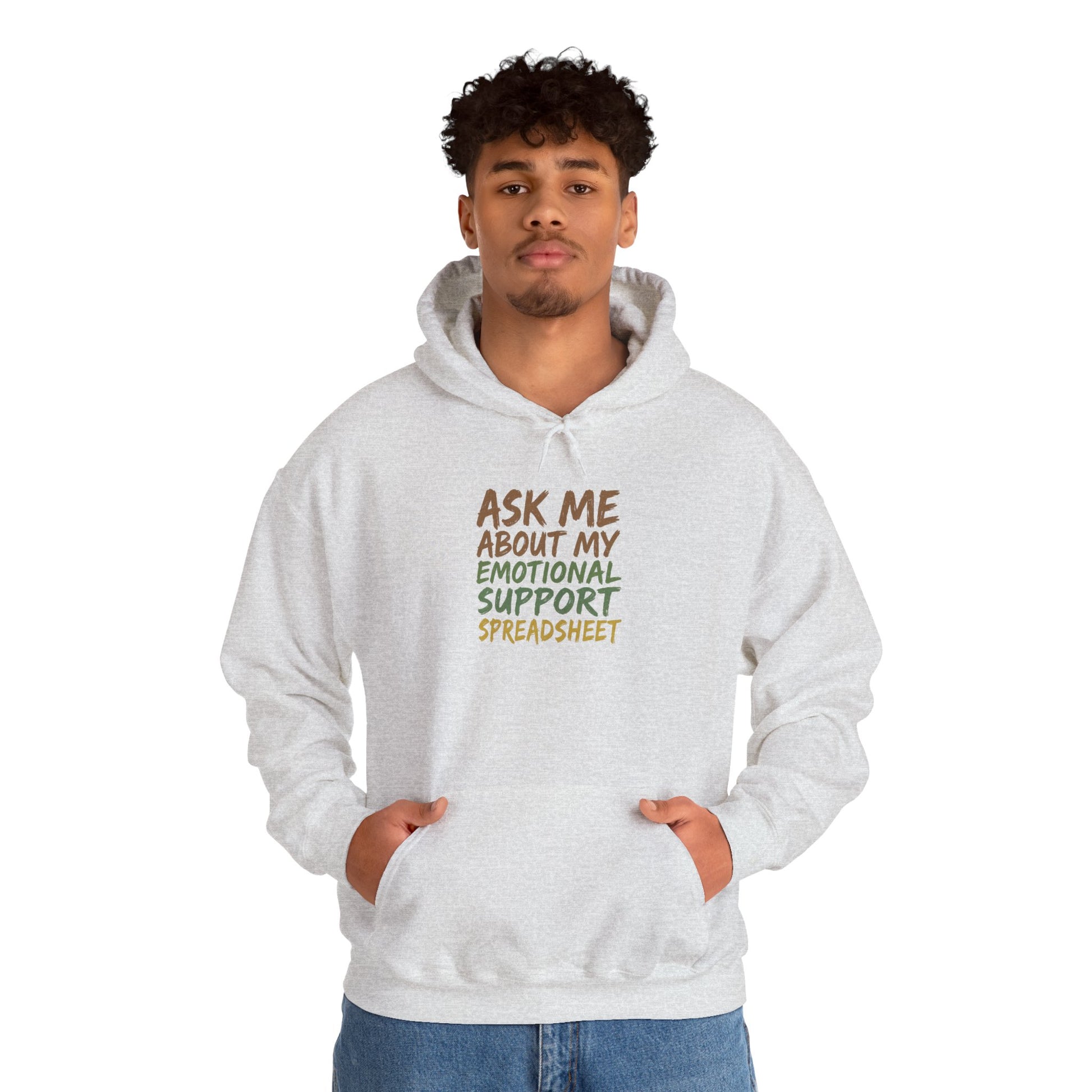 Ask Me About My Emotional Support Spreadsheet Hoodie — office-approved battle gear for the overworked and underpaid. Built tough enough to survive back-to-back pointless meetings, soft enough to nap in when “circling back” drains your soul. Kangaroo pocket for hiding snacks, pens, or the last shred of your patience. The hood? Perfect for dodging eye contact and pretending you’re “deep in analysis.” Zero hype, zero effort — just broken-in comfort with cleaner formatting than your manager’s last report.
