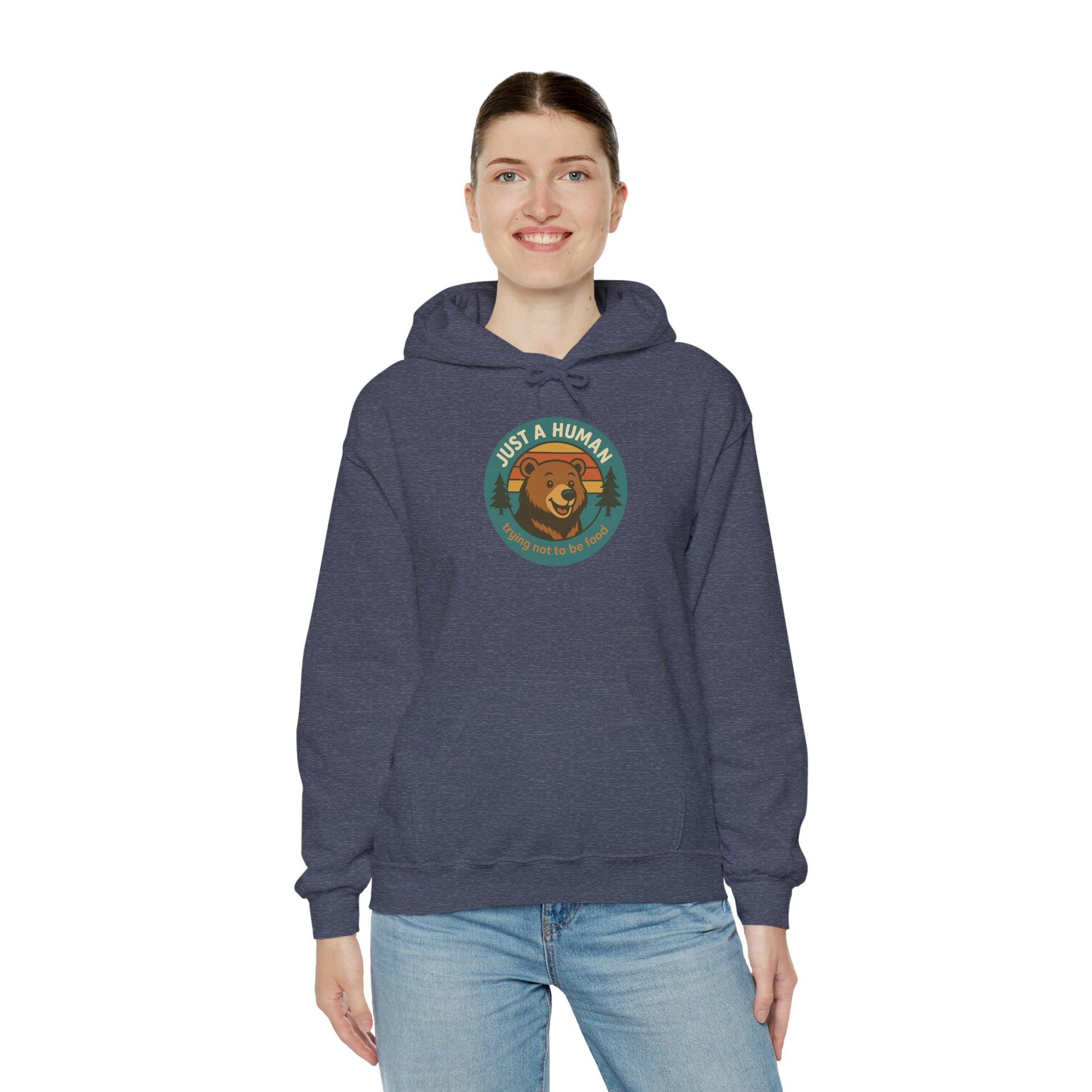 Just a Human Trying Not To Be Food — Hoodie for staying off the menu. It’s anti-hype armor you can live in—tough enough to handle whatever chaos or critter comes sniffing around, soft enough to crash in after you’ve made it through. Oversized kangaroo pocket for cold hands, contraband snacks, or the stuff nobody needs to know about. Drawstring hood locks you into “do not disturb” mode for frosty mornings, midnight escapes, or disappearing completely. No fake style. No extra effort. Just that broken-in, already-over-it vibe that keeps you moving and breathing.
