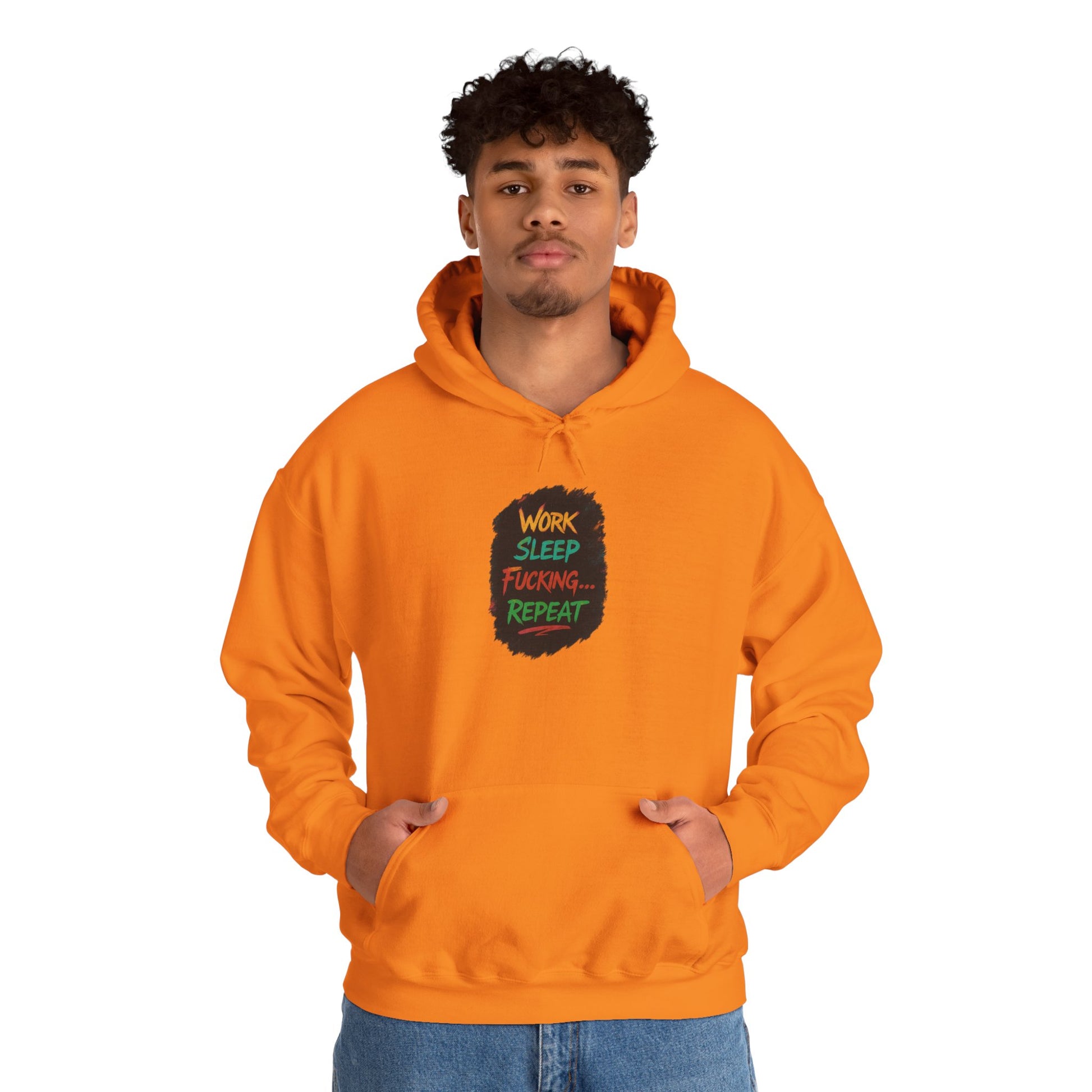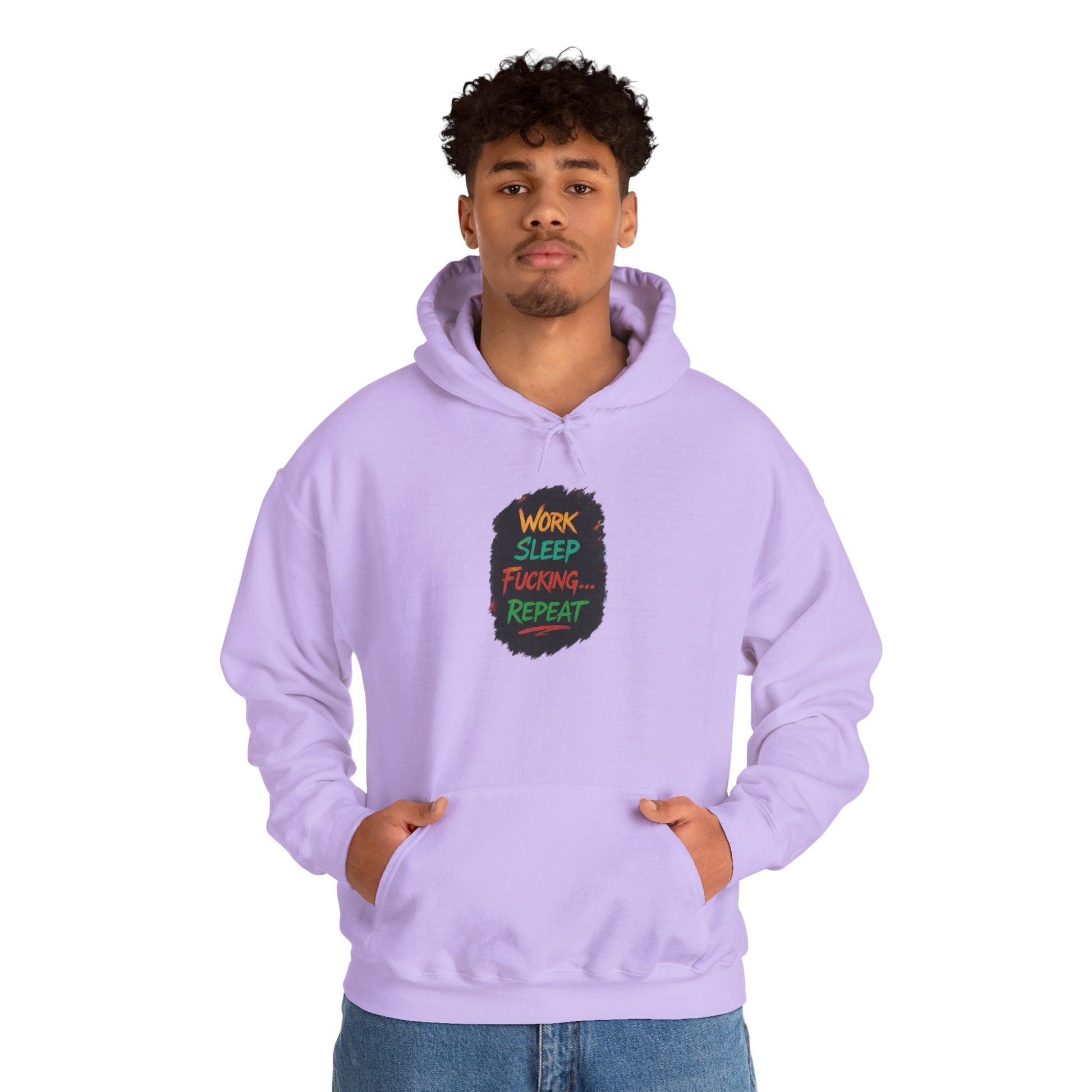 Work. Sleep. Fucking Repeat. Hoodie — your permanent loop stitched into fabric. Heavy enough to carry the weight of another shift, soft enough to crash in when the cycle eats you aliveig pocket for stashing caffeine, regrets, or tomorrow’s excuses. Drawstring hood to block out the world and the boss’s emails. Not about fashion, not about flex — just survival gear for the repeat offenders.