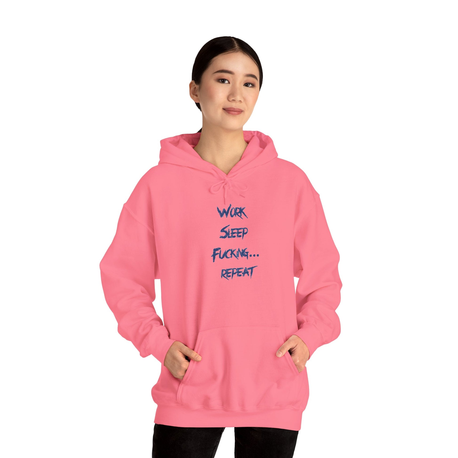 Work. Sleep. Fucking Repeat. Hoodie — your permanent loop stitched into fabric. Heavy enough to carry the weight of another shift, soft enough to crash in when the cycle eats you aliveig pocket for stashing caffeine, regrets, or tomorrow’s excuses. Drawstring hood to block out the world and the boss’s emails. Not about fashion, not about flex — just survival gear for the repeat offenders.