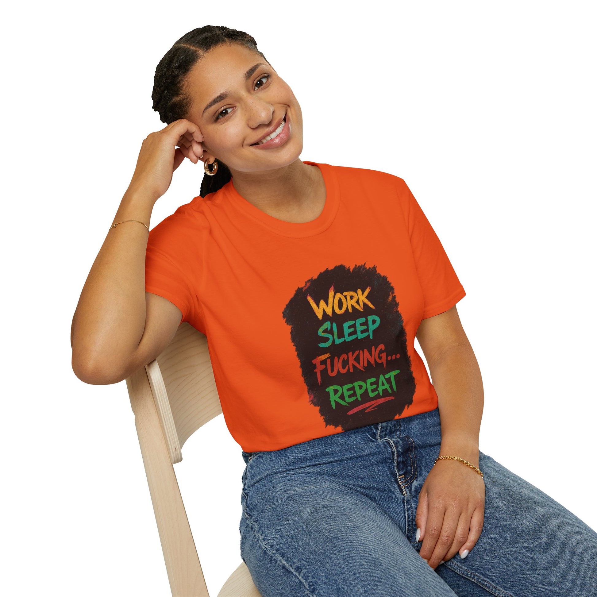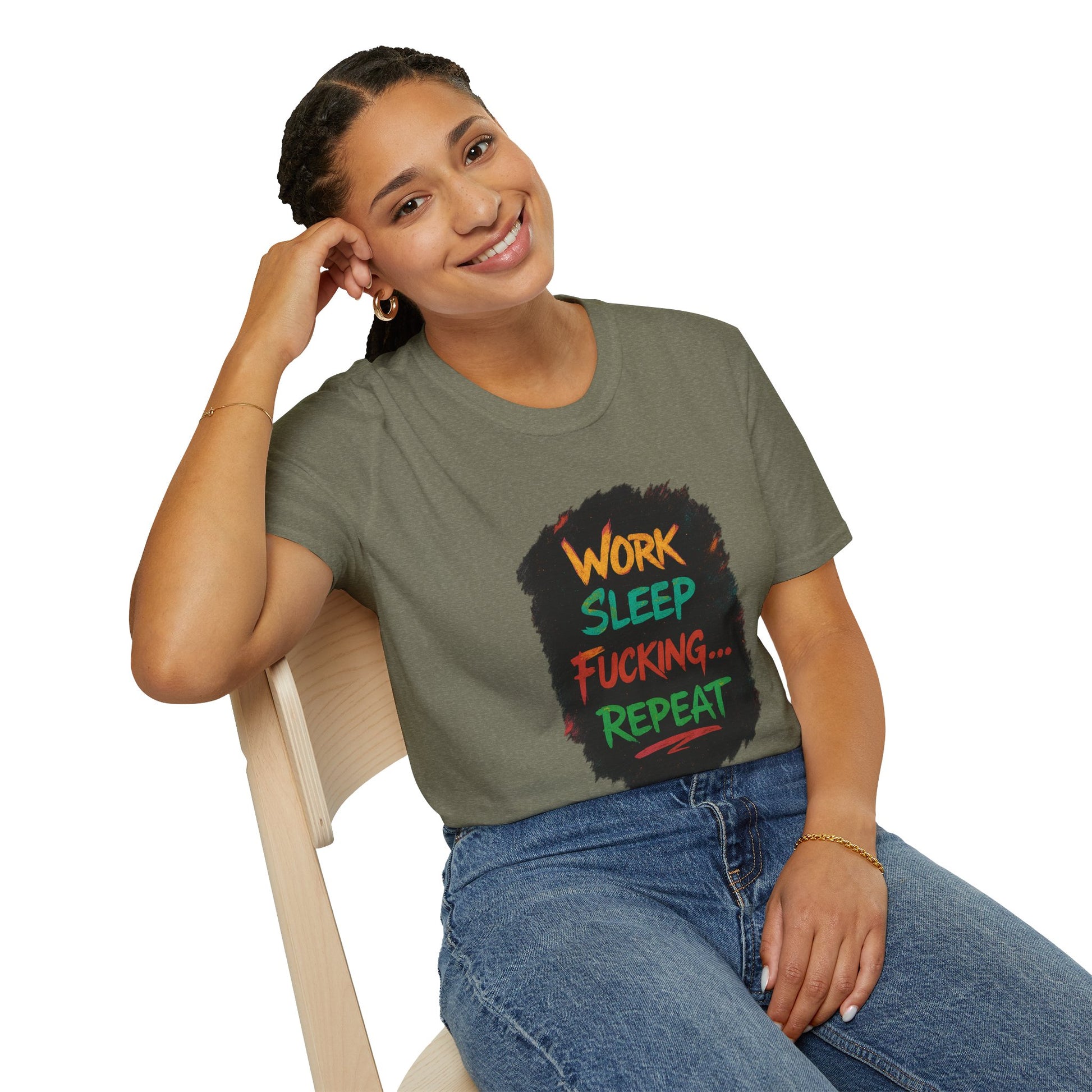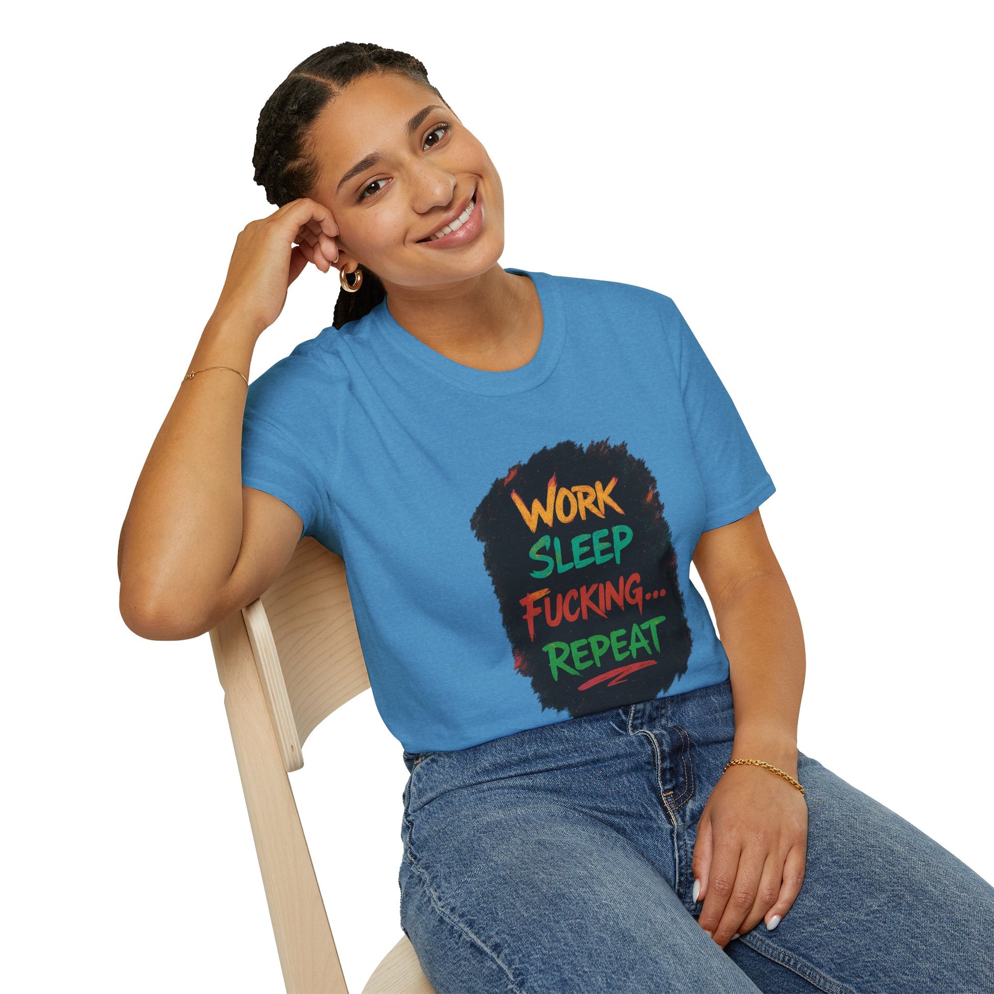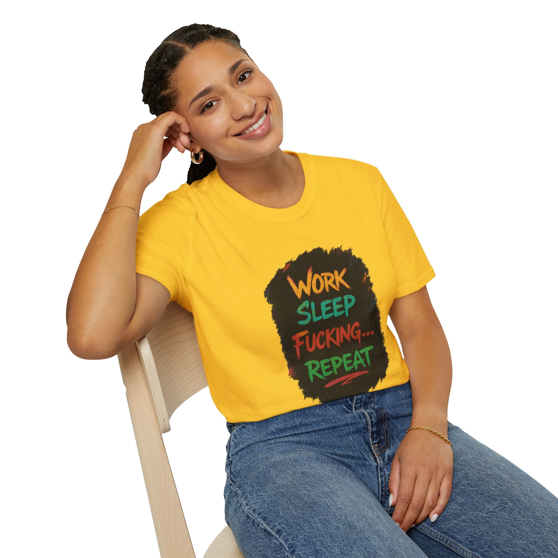 Work. Sleep. Fucking Repeat. Tee — the burnout anthem in cotton form. Worn-in, beat-up, and already done with tomorrow before it starts. Built for clocking in, blacking out, and pretending you’ll break the cycle someday (but you won’t). No flex, no fake grind, just that unapologetic, whatever-cool that shrugs its way through another round.