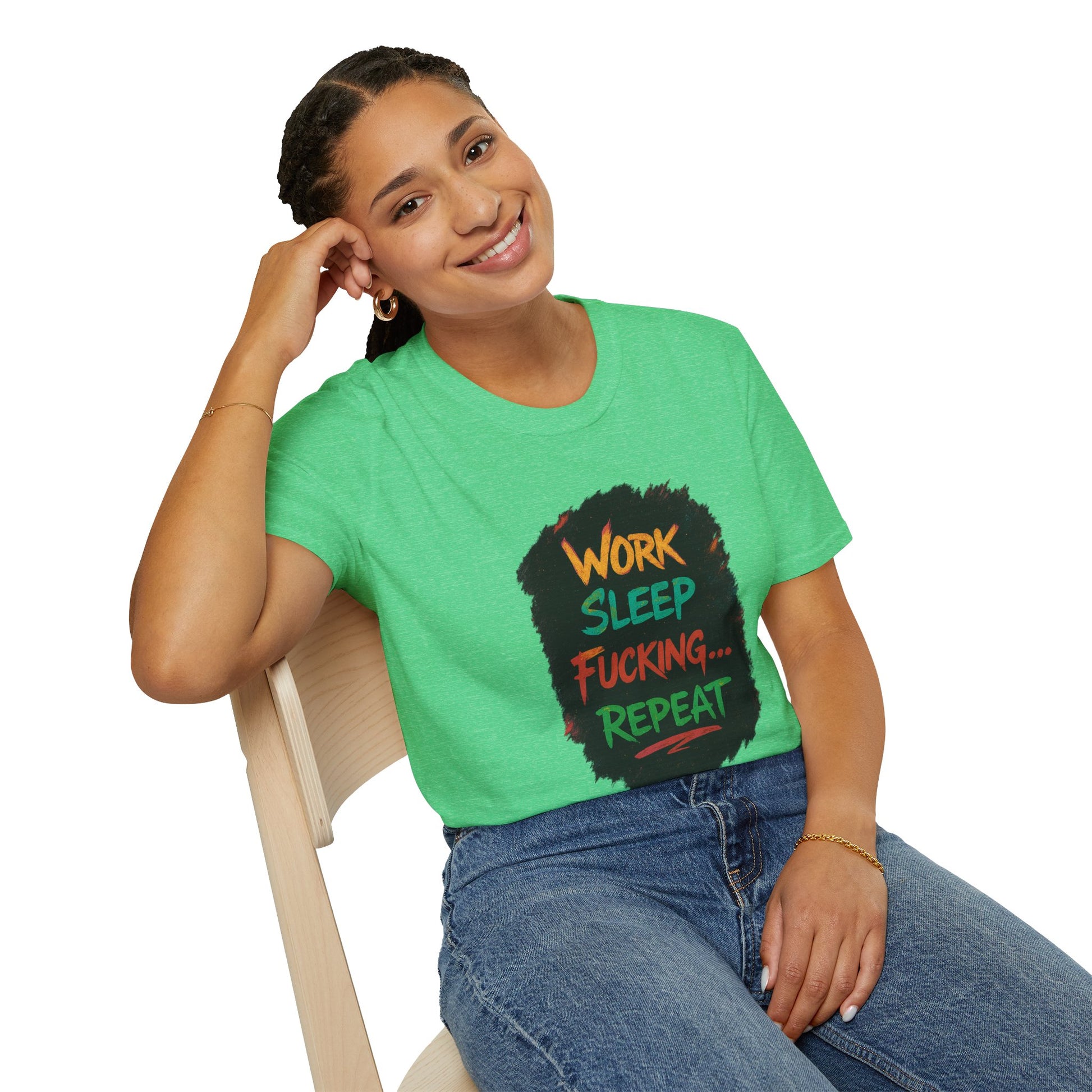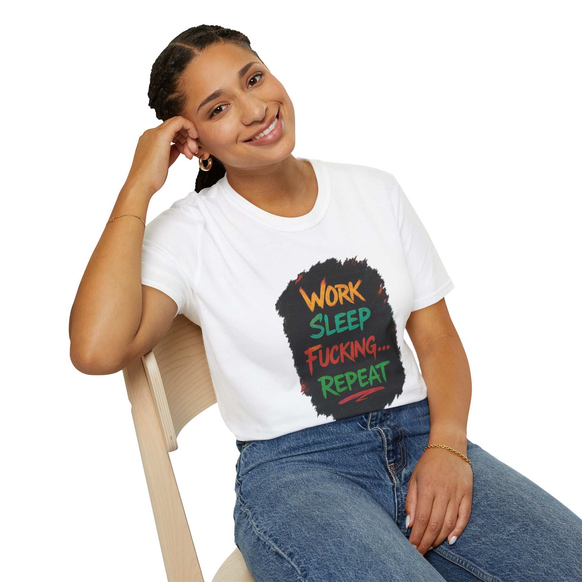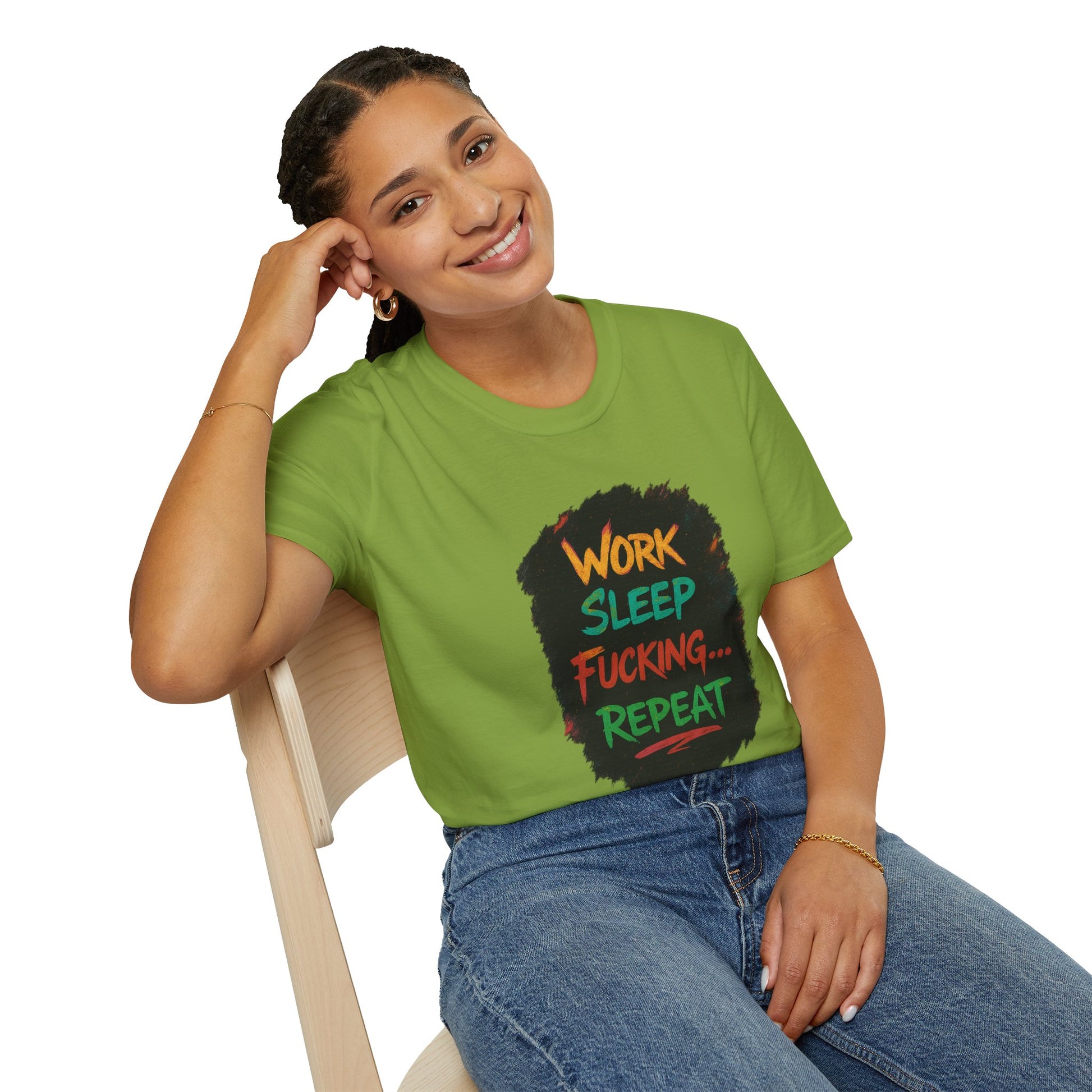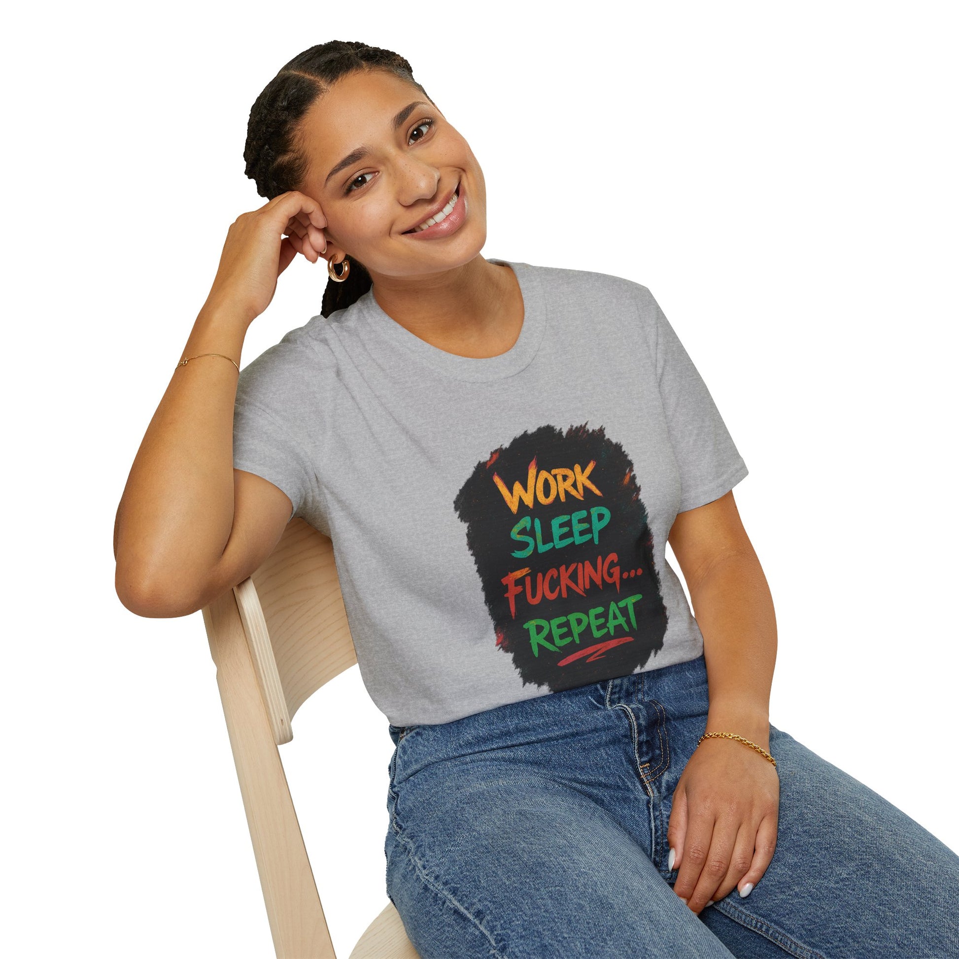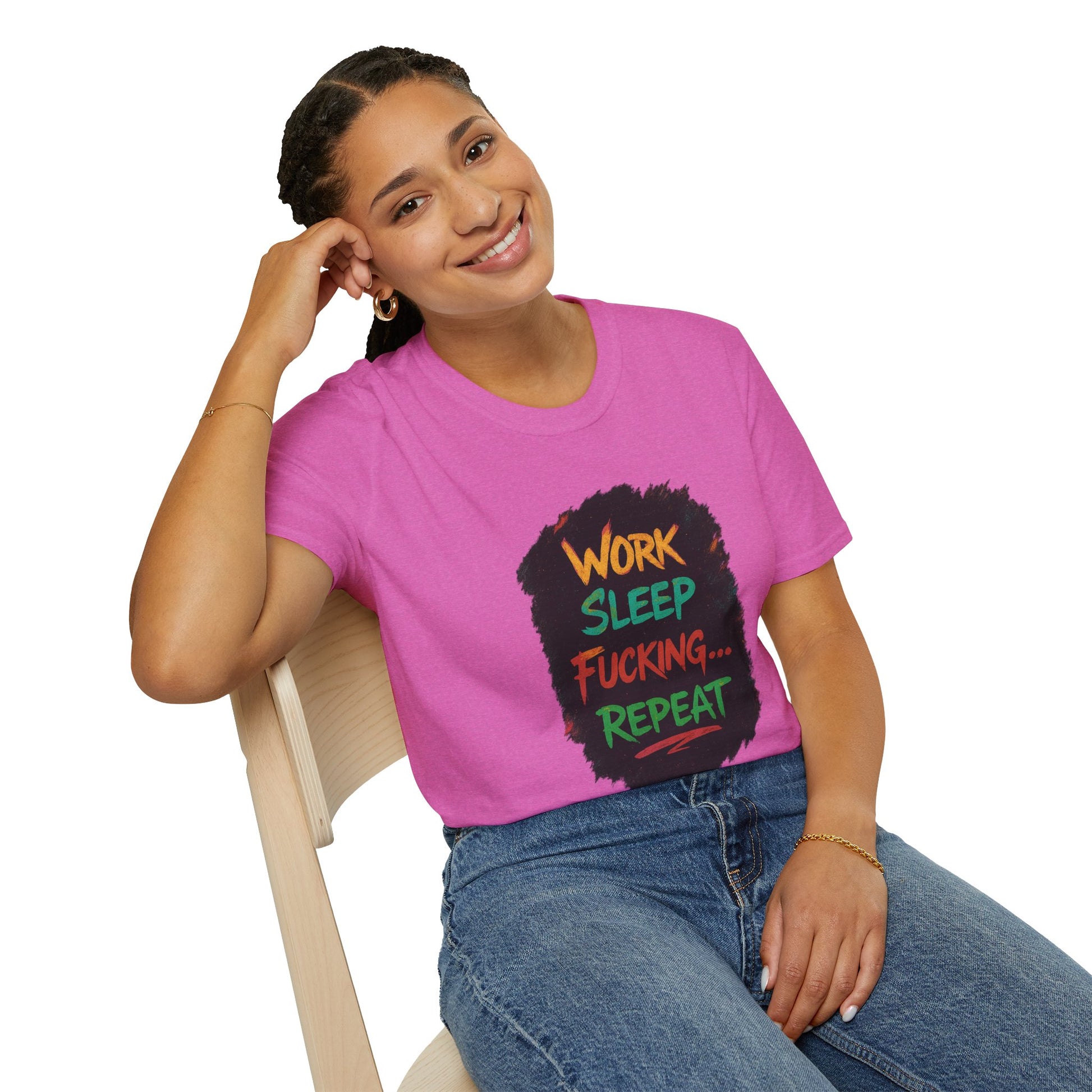 Work. Sleep. Fucking Repeat. Tee — the burnout anthem in cotton form. Worn-in, beat-up, and already done with tomorrow before it starts. Built for clocking in, blacking out, and pretending you’ll break the cycle someday (but you won’t). No flex, no fake grind, just that unapologetic, whatever-cool that shrugs its way through another round.
